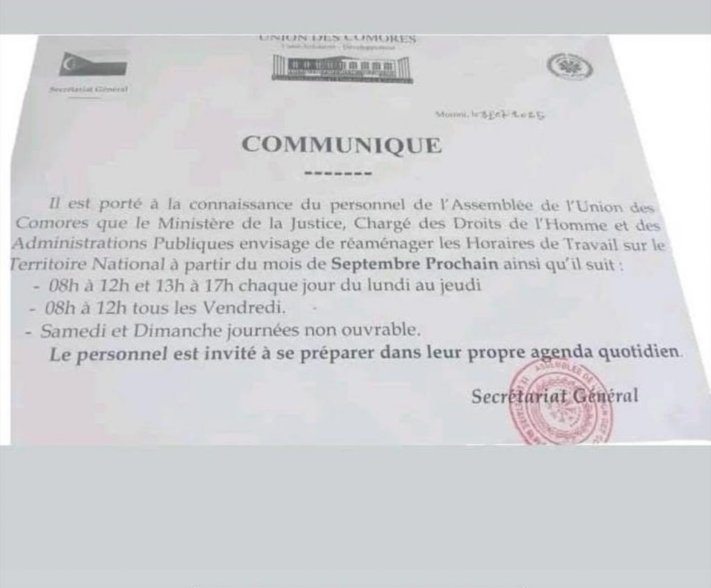 Ce réaménagement vise, selon les autorités, à améliorer la productivité et l’efficacité des services publics tout en respectant les équilibres sociaux et religieux propres au pays. Il pourrait également entraîner une meilleure conciliation entre vie professionnelle et vie personnelle des fonctionnaires comoriens.